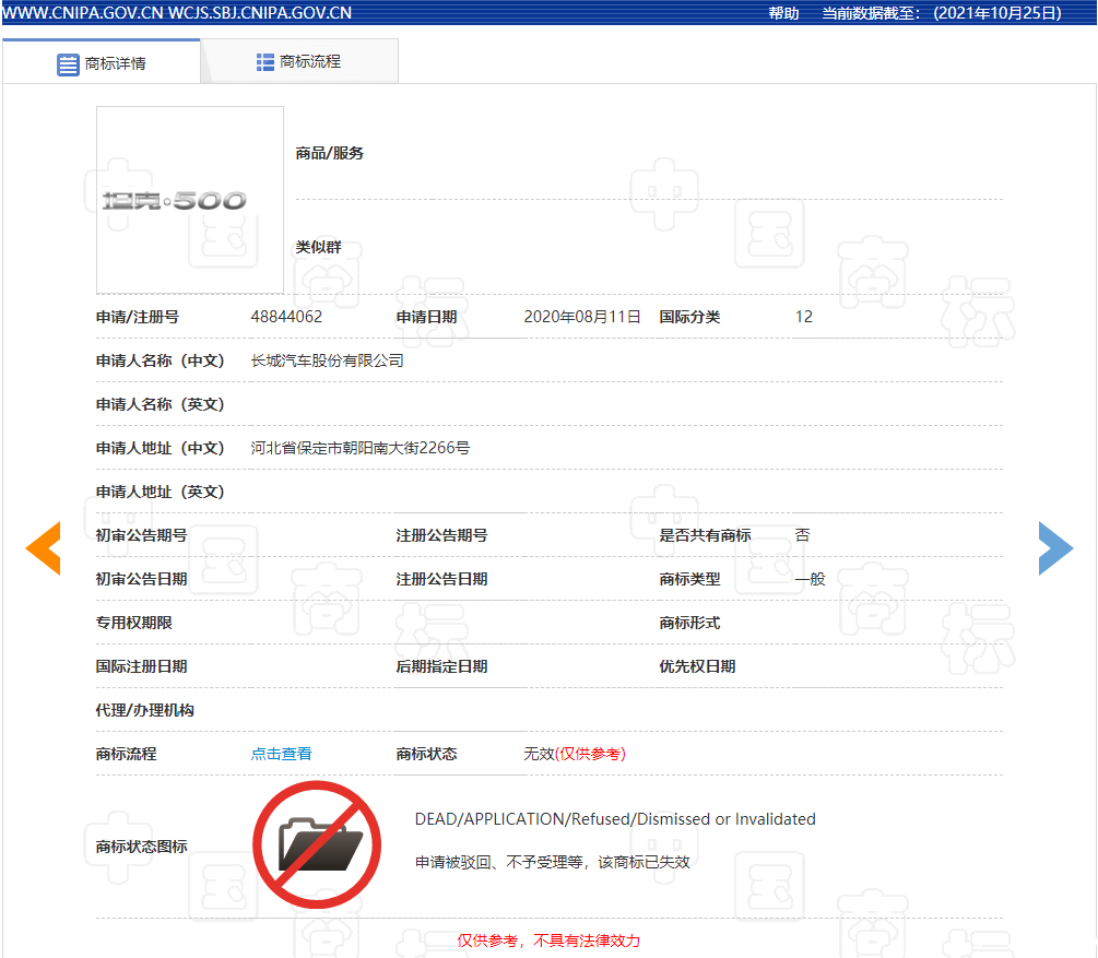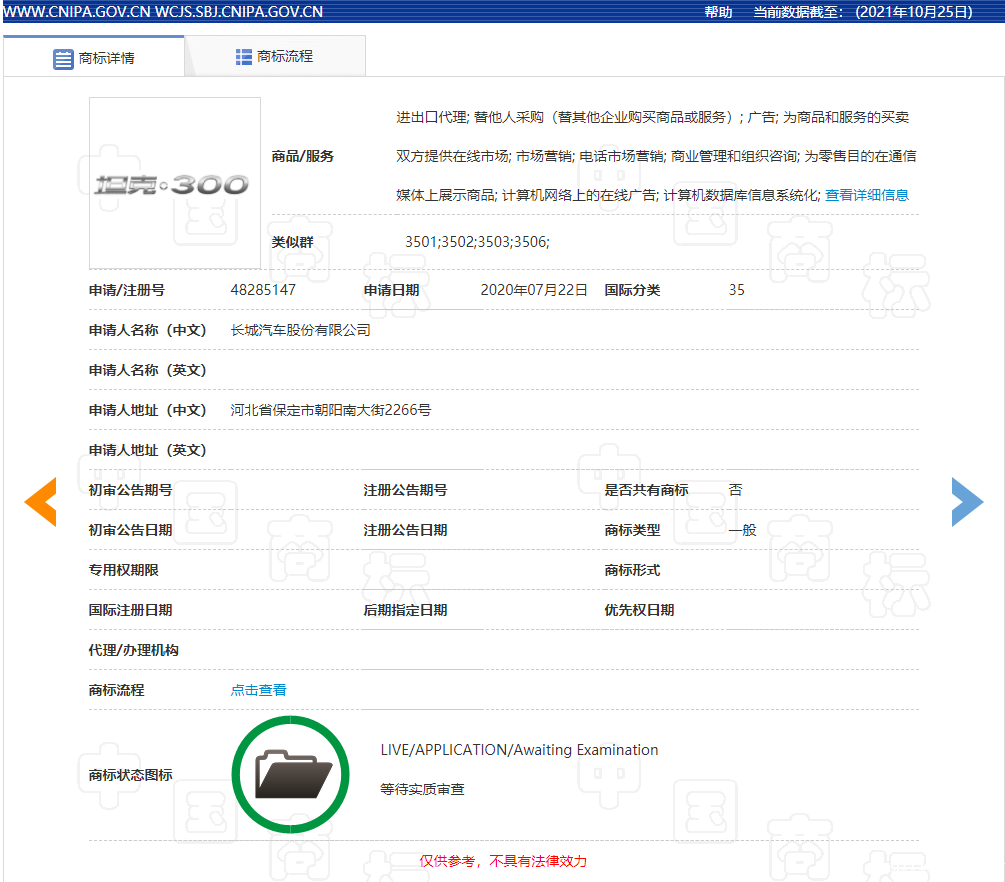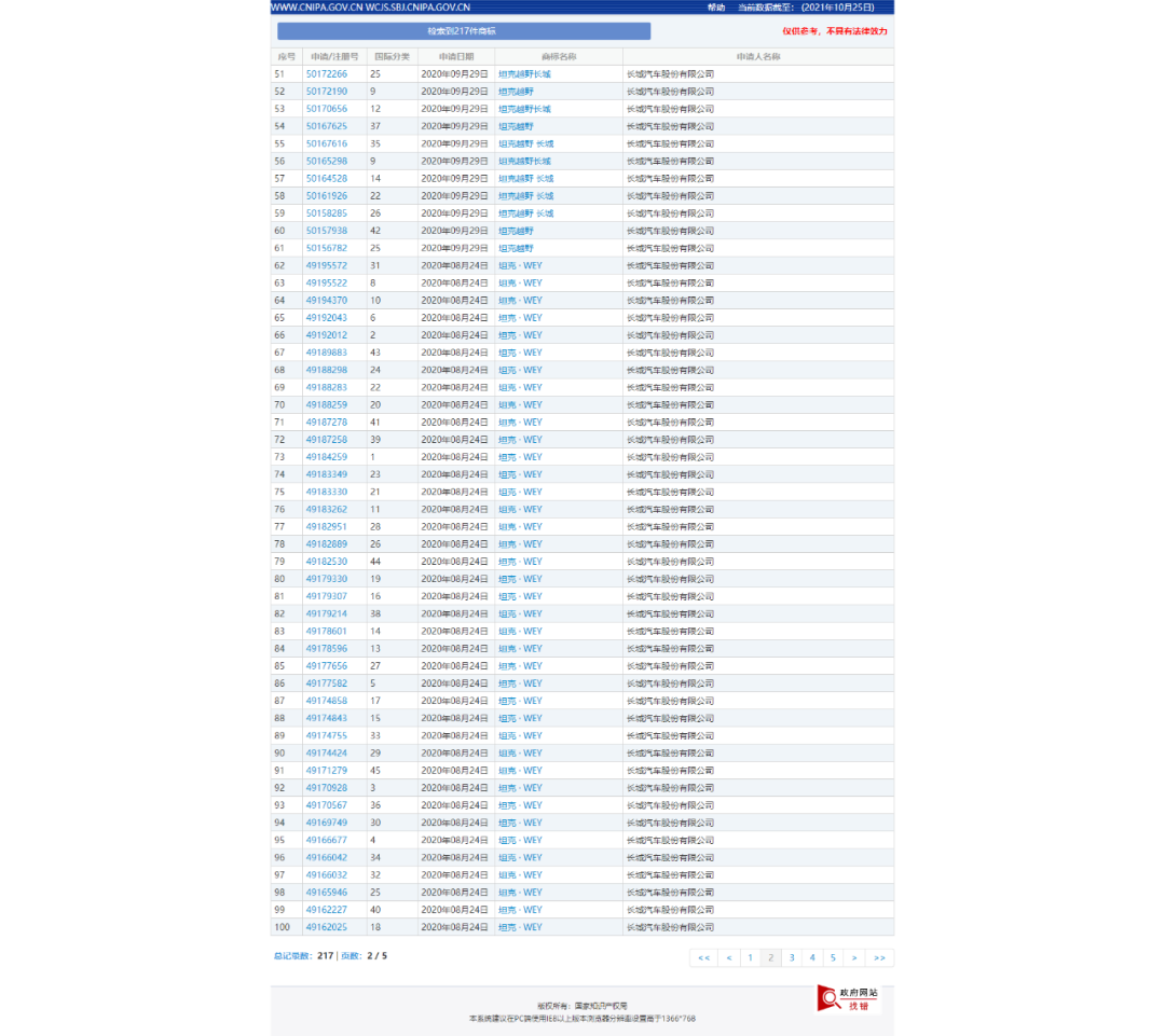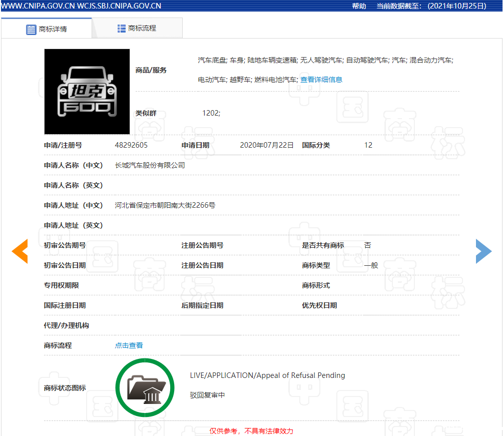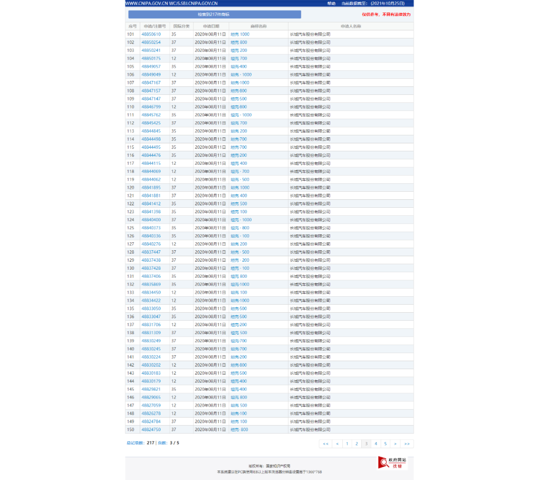 针对该事件,记者登录中国商标网对该事件中涉及的相关商标进行了检索。记者在“商标名称”一栏中以“坦克”为关键词、“申请人名称(中文)”一栏中以“长城汽车股份有限公司”为关键词进行了检索,检索结果显示,长城汽车公司共对217件含“坦克”字样商标提交了注册申请,包括“坦克汽车”“坦克越野”“坦克·WEY”“坦克·400”“坦克·500”“坦克·600”“坦克400”“坦克500”等(详情见下图1-5)。