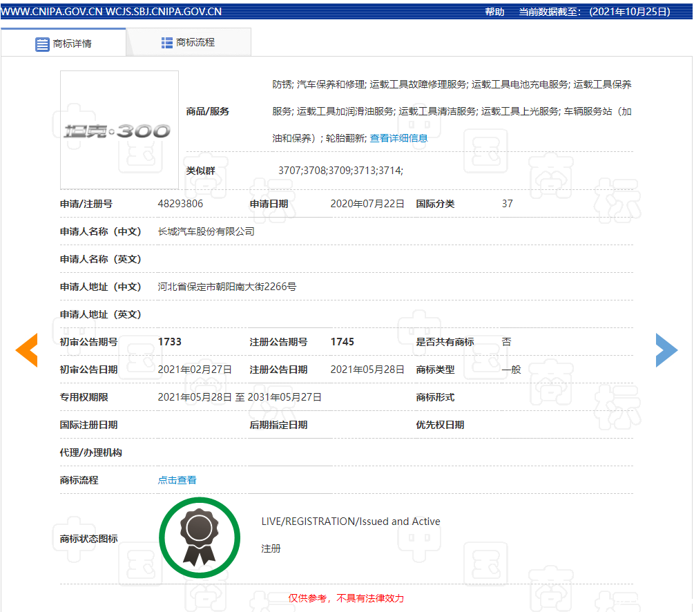 今年4月,长城汽车股份有限公司(下称长城汽车公司)推出“主打轻奢硬派越野”的全新品类品牌——坦克。近日,与坦克汽车相关的一批商标处于无效状态一事,引发广泛关注。不少报道称,长城汽车公司申请注册的“坦克WEY”“坦克400”“坦克500”和“坦克600”等商标,均处于无效状态,而“坦克300”商标目前的状态是驳回复审中。