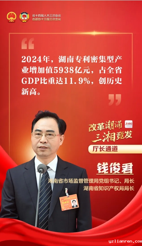 “2025年,我们将聚焦高质量创造、高效益运用、高标准保护、高品质服务,用知识产权的‘繁星点点’,点亮湖南高质量发展的‘星光大道’。”1月16日,在湖南省十四届人大三次会议第二场“厅长通道”上,湖南省市场监督管理局党组书记、局长,省知识产权局局长钱俊君回应民之关切。