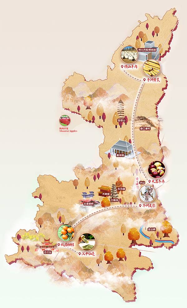 在陕西,不仅有辽阔山河,还有惬意生活。从陕北到陕南,我们精心设计了一条陕味十足的“IP游玩路线”,以地理标志产品为主角,串联起这片土地上的风土人情。沿着这条路线,我们邀请读者一同逛名胜、赏美景、品佳肴、看展演,打卡一个个宝藏目的地。快来跟我们一起玩出陕西“IP新花样”吧!