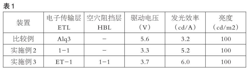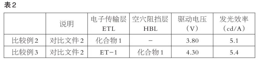 第二部分补交实验数据涉及对比文件2的化合物1,具体采用本申请说明书实施例2-3的器件制造方法制备了有机电致发光器件,使用对比文件2的化合物1作为电子传输层或空穴阻挡层,对器件的发光特性进行测定,如表2所示。